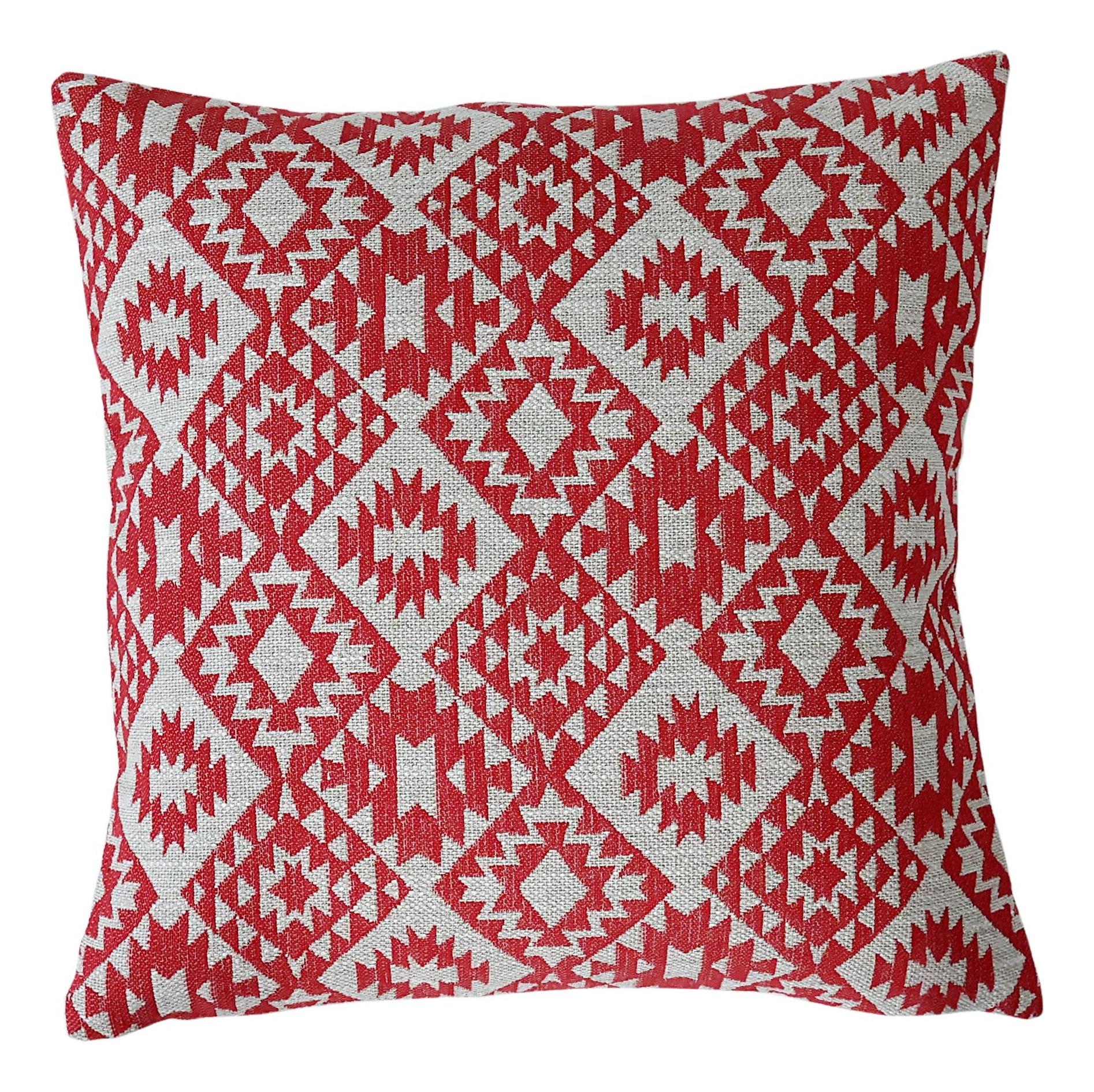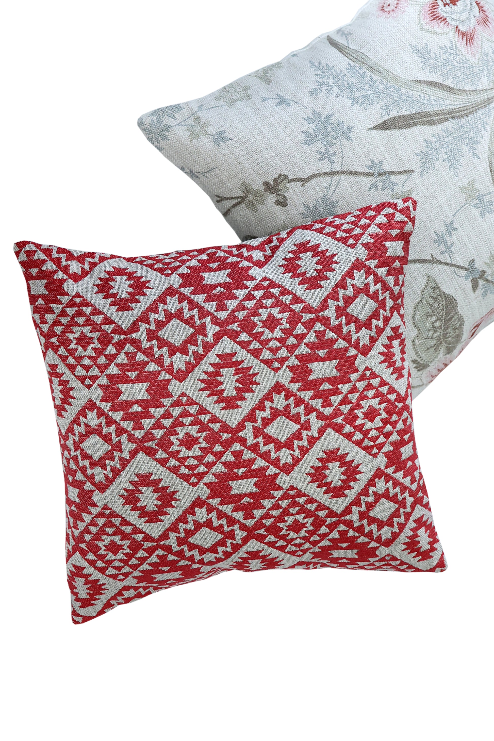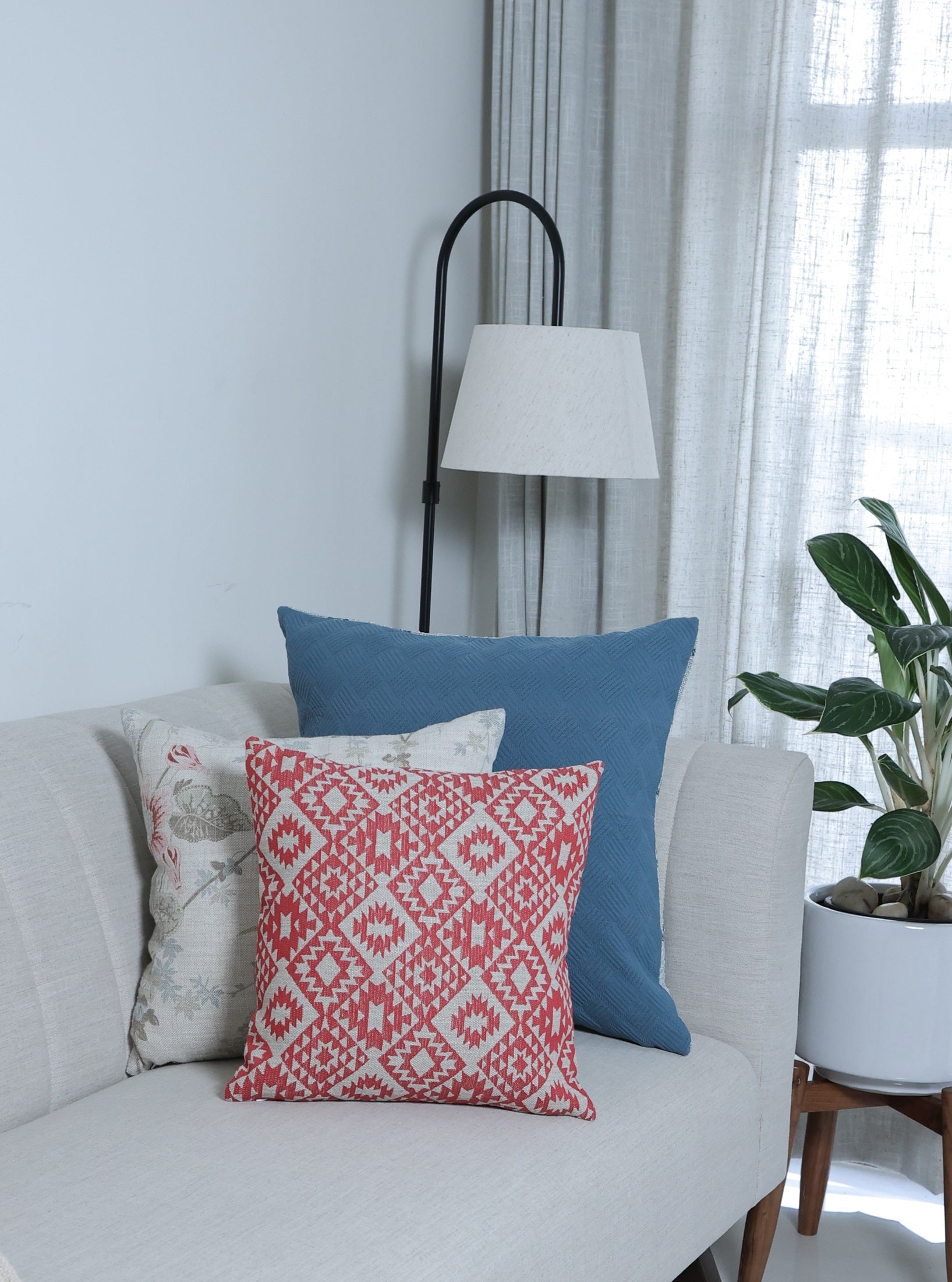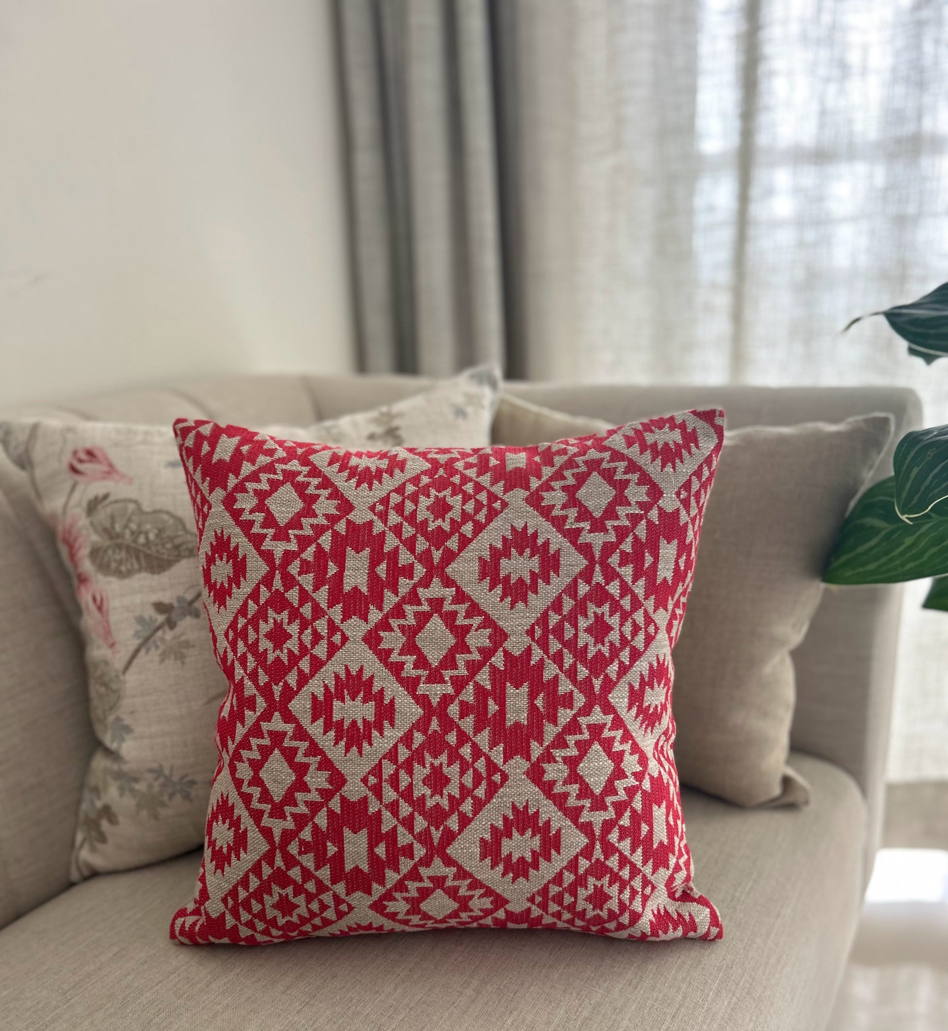 Geometric Jacquard weaving of linen cotton and viscose blend cushion cover.