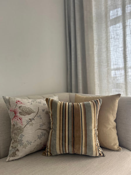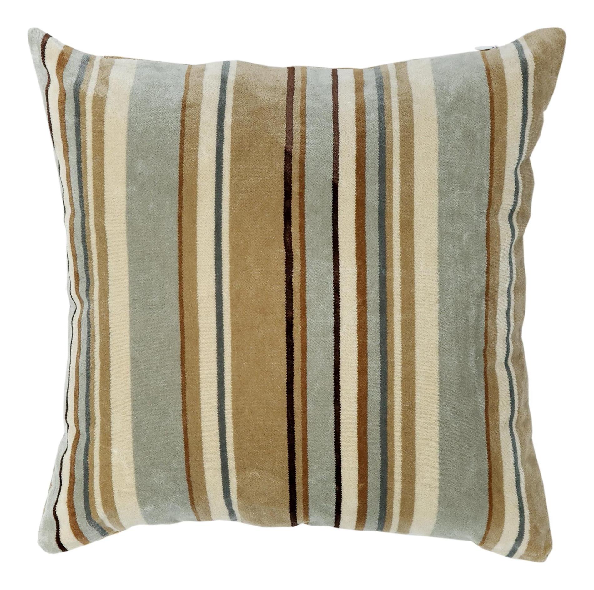 Cushion made up of soft woven fabric with beige, brown and sage stripes