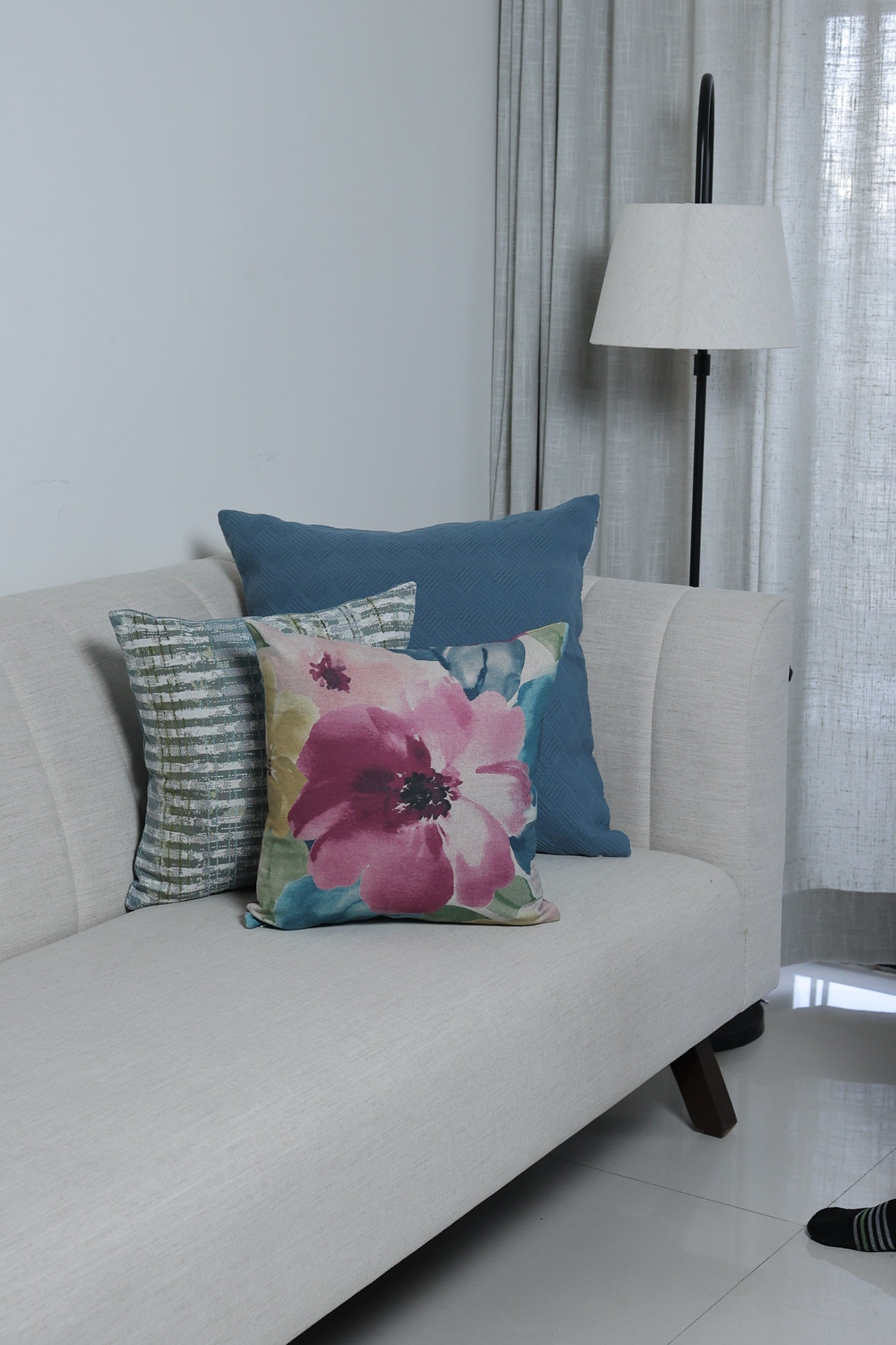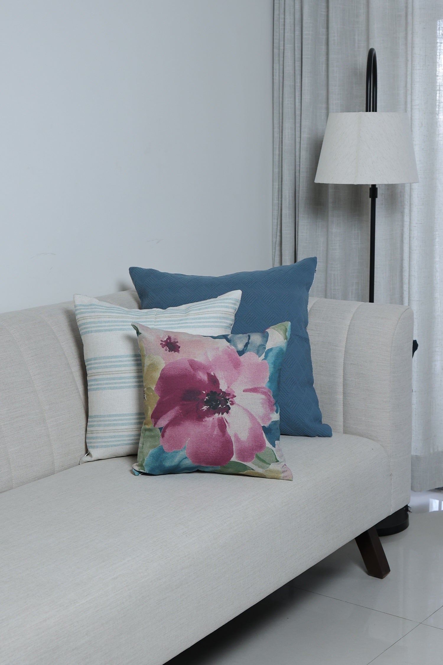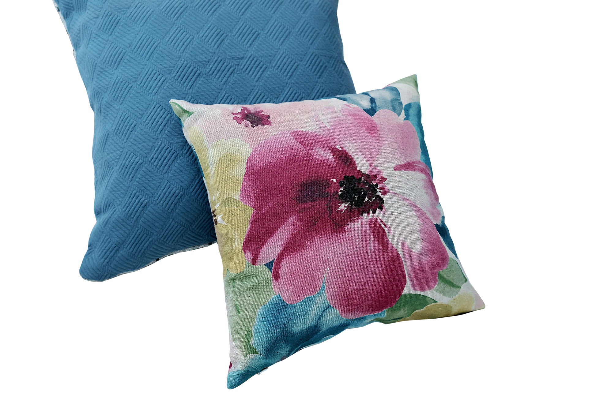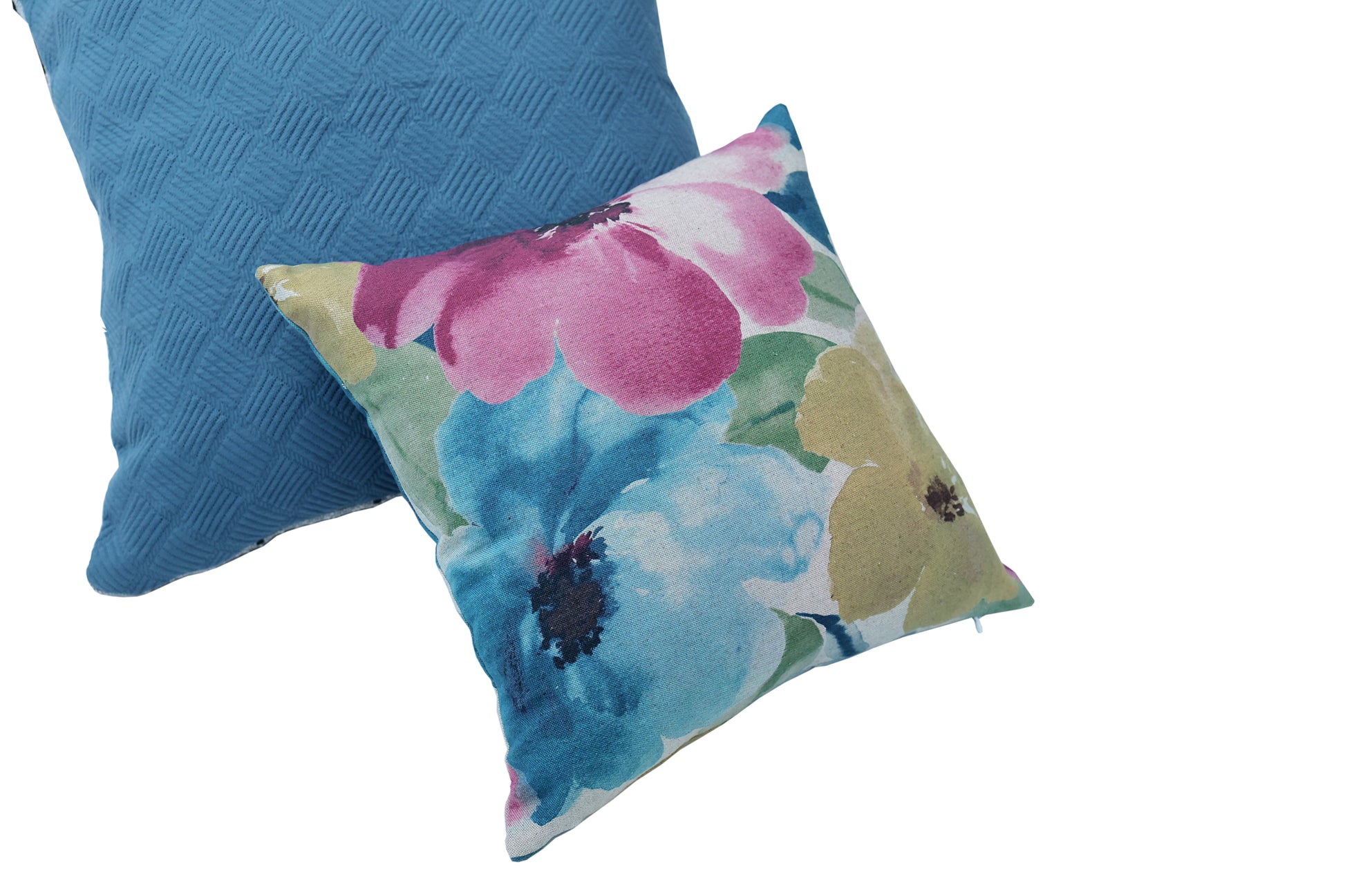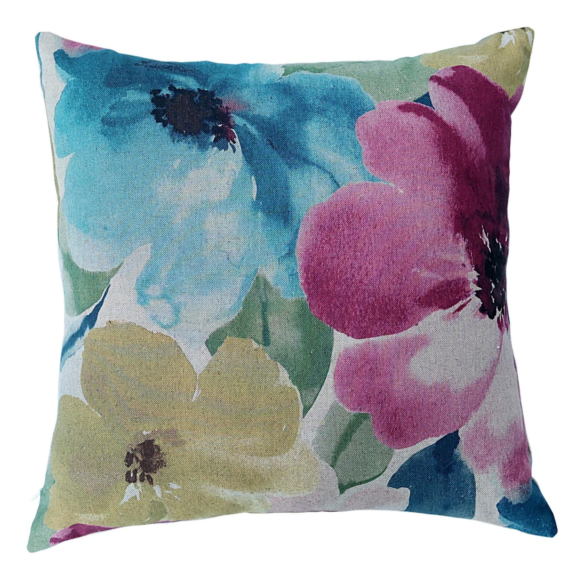 Cushion cover with abstract floral design in multiple shades of pink, teal and green with cotton lining inside